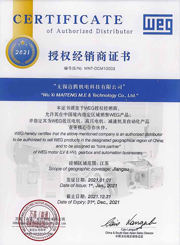 無錫邁騰機電科技有限公司成立于2007年,是WEG中國官方授權(quán)的服務(wù)經(jīng)銷商,致力于電機設(shè)備技術(shù)的發(fā)展和研究,業(yè)務(wù)集裝備研發(fā)、設(shè)計、改造、安裝、服務(wù)于一體,提供產(chǎn)品全生命周期服務(wù),堅持創(chuàng)新,采用新理念,開發(fā)新產(chǎn)品,不斷追求工業(yè)進(jìn)步,助力行業(yè)發(fā)展。